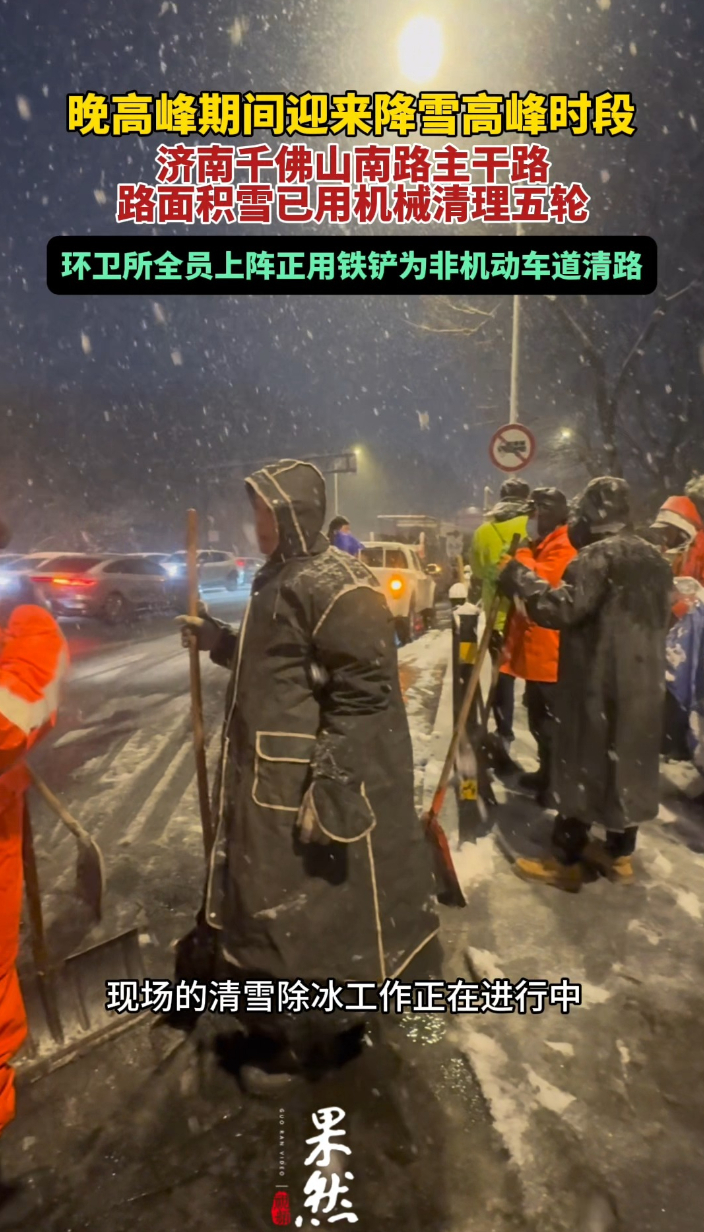 果然视频|晚高峰遇降雪高峰期,环卫工人用铁铲给非机动车清路齐鲁晚报·齐鲁壹点客户端 12-12原创12日,济南交通晚高峰遇降雪高峰期,济南千佛山南路主干路路面积雪已用机械清理两轮,环卫所全员上阵正用铁铲为非机动车道清路。(齐鲁晚报·齐鲁壹点 李梦瑶 见习记者 冯子芯)