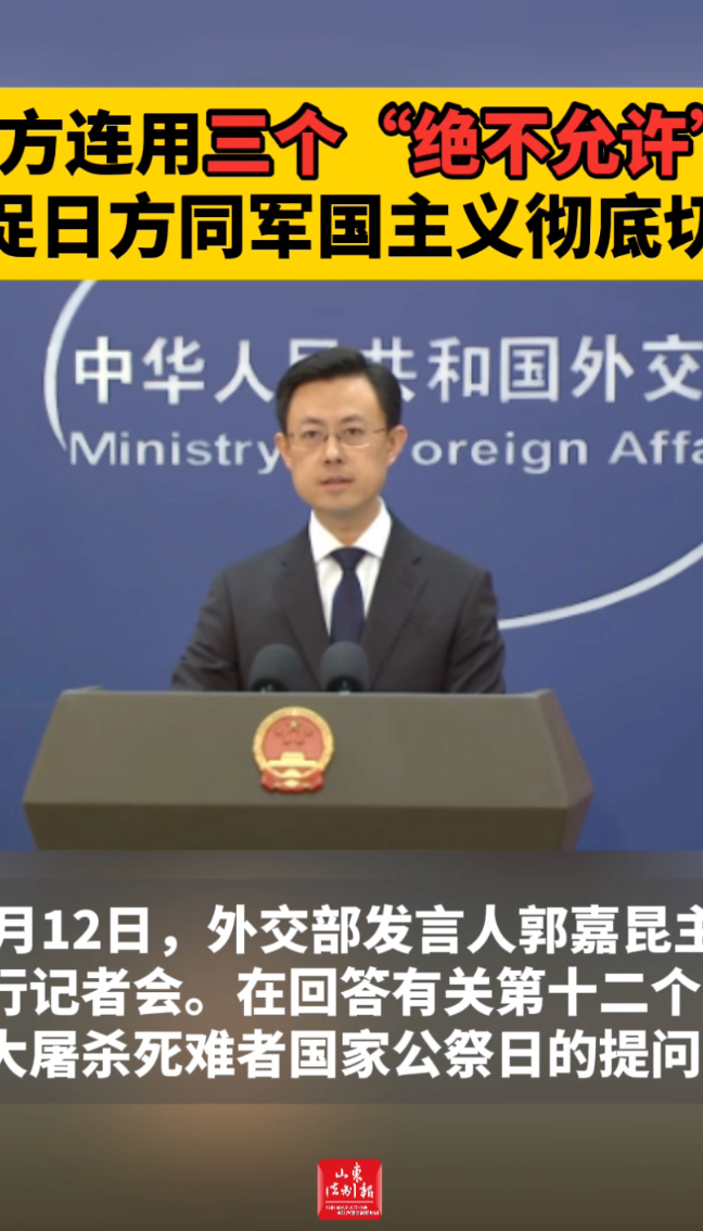 12月12日,外交部发言人郭嘉昆主持例行记者会。在回答有关第十二个南京大屠杀死难者国家公祭日的提问时,郭嘉昆表示,我们绝不允许日本右翼势力开历史倒车,绝不允许外部势力染指中国台湾地区,绝不允许日本军国主义死灰复燃。