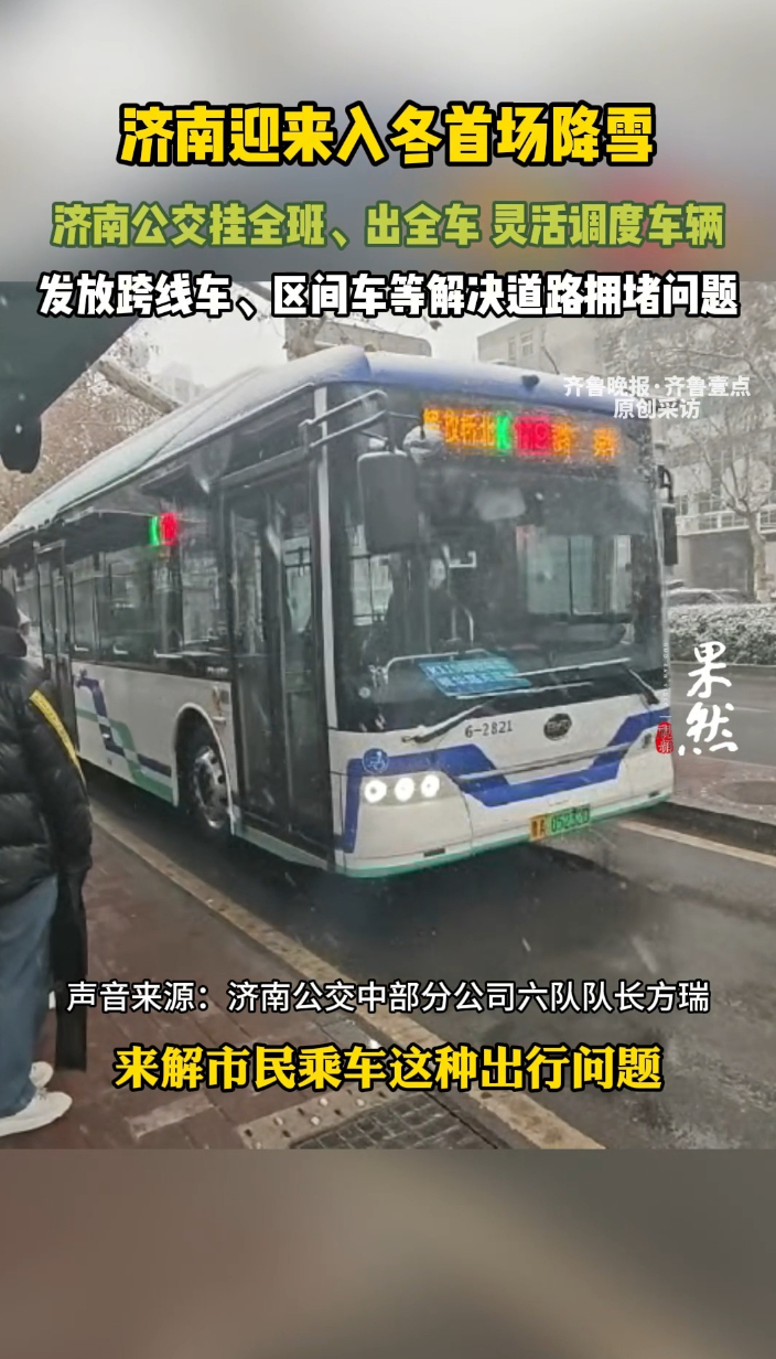 果然视频|济南迎来入冬首场降雪,济南公交灵活调度保障市民出行齐鲁晚报·齐鲁壹点客户端 12-12原创12月12日,济南迎来入冬首场降雪。济南公交中部分公司六队队长方瑞告诉齐鲁晚报·齐鲁壹点记者,面对此次降雪,济南公交挂全班、出全车,增加车辆班次、灵活调度解决客流高峰突增等问题;发放大站快车、跨线车、区间车等形式解决道路拥堵等问题,保障市民出行。(齐鲁晚报·齐鲁壹点爆料电话:0531-85193656;邮箱:405617016@qq.com)
