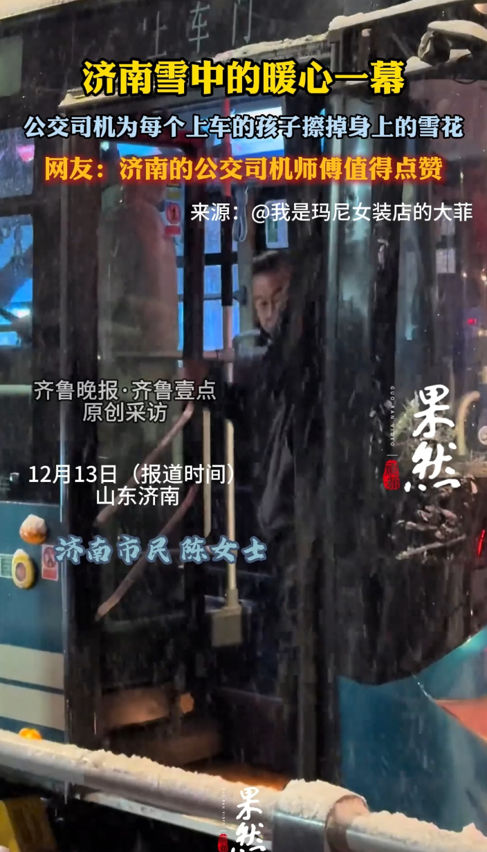 果然视频|济南雪中的暖心瞬间:公交司机为上车孩子擦雪