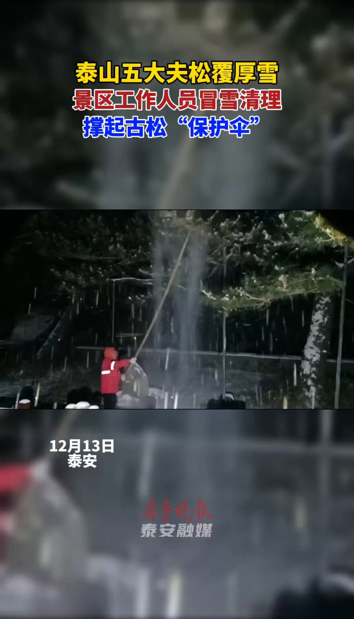 剪辑 徐慧 泰山五大夫松覆厚雪,景区工作人员冒雪清理,撑起古松“保护伞”。