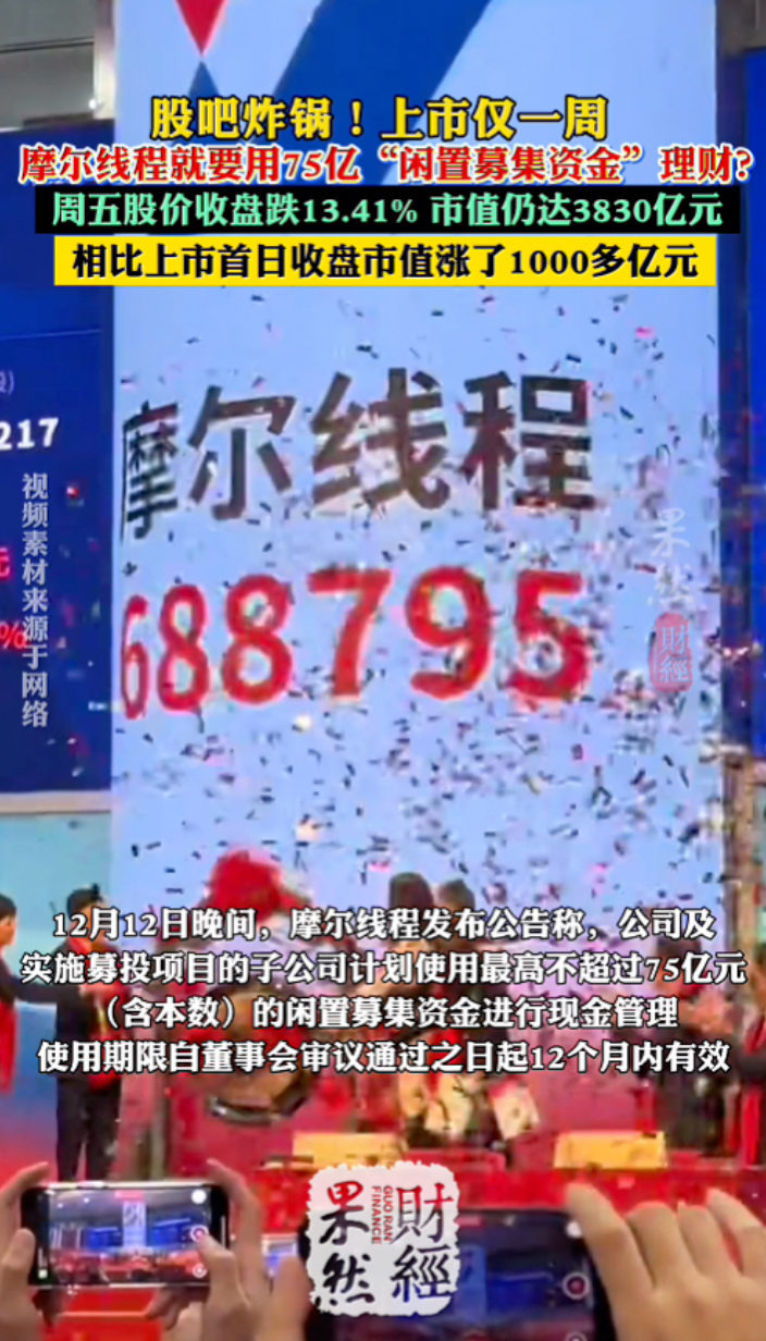 果然财经|上市仅一周,摩尔线程要用75亿“闲置募集资金”理财齐鲁晚报·齐鲁壹点客户端 12-13原创12月12日晚间,摩尔线程发布公告称,公司及实施募投项目的子公司计划使用最高不超过75亿元(含本数)的闲置募集资金进行现金管理,使用期限自董事会审议通过之日起12个月内有效。2025年12月5日,摩尔线程登陆科创板。其上市发行7000万股,占发行后总股本14.89%。12月12日,摩尔线程股价收盘跌13.41%,市值仍达到3830亿元,相比上市首日收盘市值涨了1000多亿元。