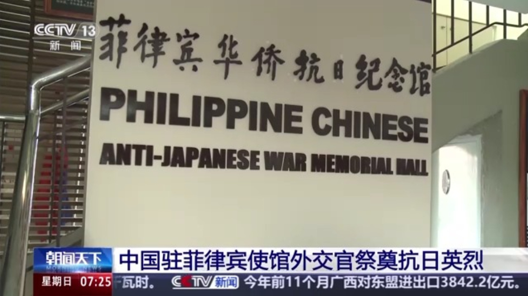 中国驻菲律宾使馆外交官祭奠抗日英烈央视新闻 12-14中国驻菲律宾大使井泉和使馆外交官们13日当天前往马尼拉华侨义山公墓祭奠抗日英烈。菲律宾华侨善举总会、菲律宾“华支”后裔联谊会代表参加活动。参加祭奠活动的代表们在烈士纪念碑前肃立并敬献花圈,深切缅怀抗日英烈。(央视新闻)