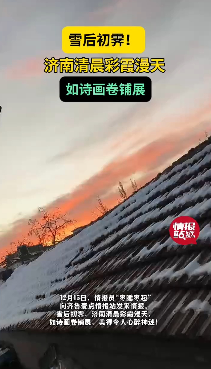 天气情报站|雪后初霁!济南清晨彩霞漫天,如诗画卷铺展 昨天08:02 大众报业·齐鲁壹点 微信扫码扫码下载客户端12月15日,情报员“枣睡枣起”向齐鲁壹点情报站发来情报。雪后初霁,济南清晨彩霞漫天,如诗画卷铺展,美得令人心醉神迷!据济南市气象台消息,14日夜间到15日白天,晴间多云,南风3~4级阵风6级,最低气温市区2℃左右,其他区县﹣4~3℃,最高气温10℃左右。