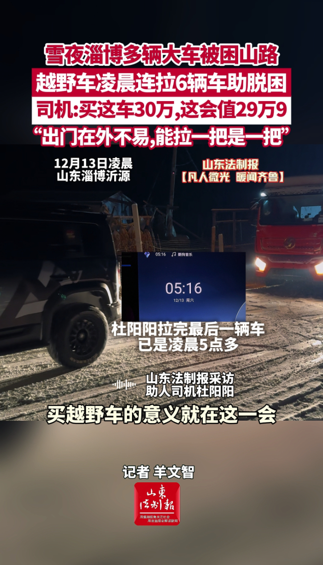 12月13日凌晨,淄博市民杜阳阳在沂源山区驾车行驶途中,发现多辆大车因暴雪天气被困山路。杜阳阳果断下车,取出随车携带的牵引绳,驾驶自己的越野车连拉6辆大车帮助脱困。