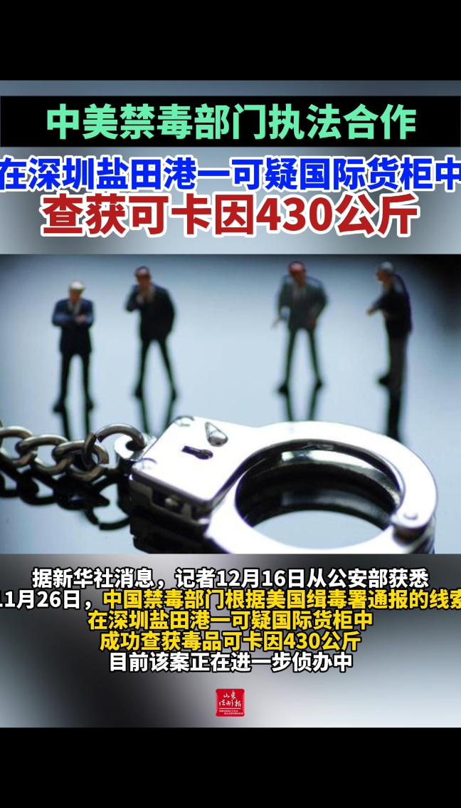 中美禁毒部门执法合作,在深圳盐田港一可疑国际货柜中,查获可卡因430公斤 昨天18:40 现场新华社 微信扫码扫码下载客户端据新华社消息,记者12月16日从公安部获悉,11月26日,中国禁毒部门根据美国缉毒署通报的线索,在深圳盐田港一可疑国际货柜中,成功查获毒品可卡因430公斤。目前该案正在进一步侦办中。