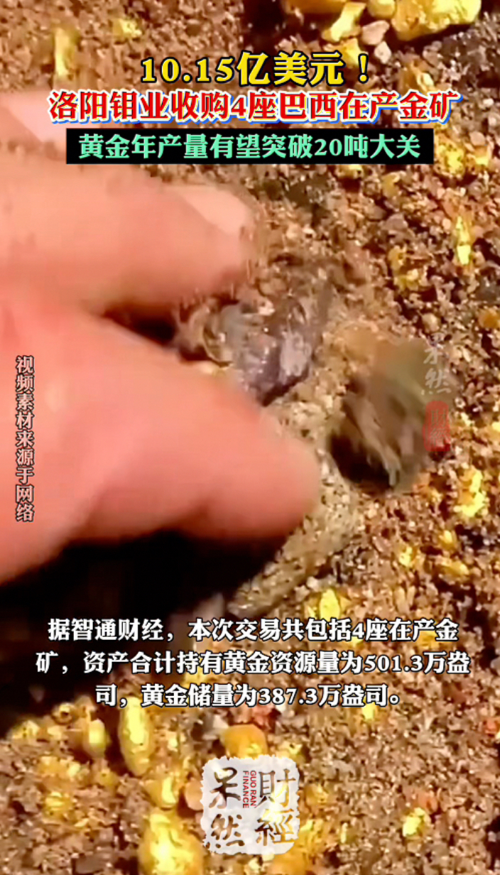 果然财经|10.15亿美元!洛阳钼业收购4座巴西在产金矿齐鲁晚报·齐鲁壹点客户端 13:30原创12月15日,洛阳栾川钼业集团股份有限公司发布公告称,控股子公司洛阳钼业控股有限公司及其下属新设全资子公司与加拿大上市公司 Equinox Gold Corp.及其全资子公司Leagold Mining Corporation签署协议。据智通财经,将以总计10.15亿美元的对价收购位于巴西三个金矿资产的100%权益,包括Aurizona 金矿、RDM 金矿以及Bahia综合矿区。