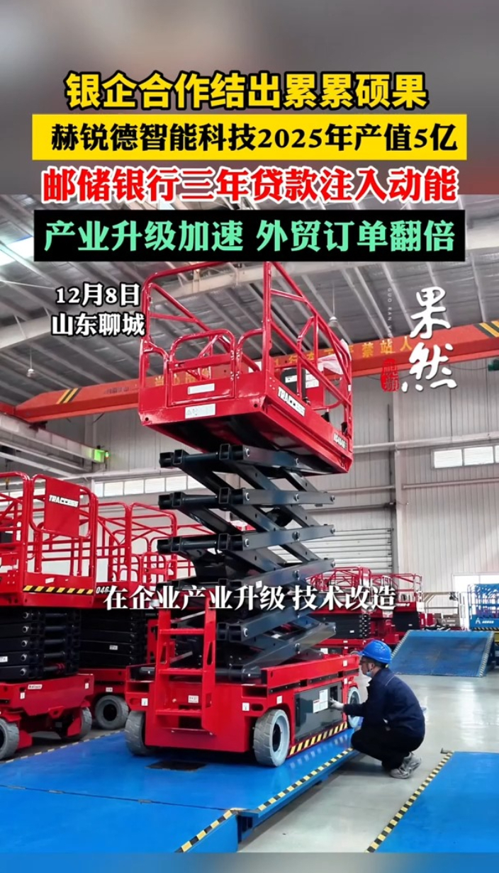银企合作结出累累硕果,赫锐德智能科技2025年产值5亿大众报业·齐鲁壹点 13:42赫锐德(山东)智能科技有限公司财务总监焦延文表示,赫锐德(山东)智能科技有限公司成立于2019年,主要经营高空作业平台智能装备。到2025年,其产值预计能够达到5亿元。为了加快实现绿色高质量发展,该公司积极与邮储银行冠县支行开展金融合作。自2022年起,邮储银行连续三年为其提供贷款支持,这在企业的产业升级、技术改造以及外贸业务拓展等方面都发挥了重要作用。(齐鲁晚报·齐鲁壹点 国晓宁)
