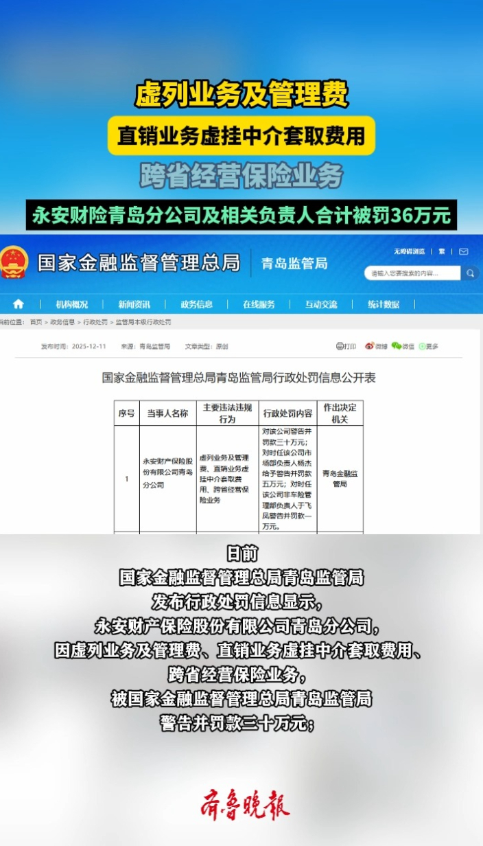 果然视频丨涉多项违规!永安财险青岛分公司及负责人被罚36万元齐鲁晚报·齐鲁壹点客户端 14:09原创日前,国家金融监督管理总局青岛监管局发布行政处罚信息显示,永安财产保险股份有限公司青岛分公司,因虚列业务及管理费、直销业务虚挂中介套取费用、跨省经营保险业务,被警告并罚款三十万元;时任该公司市场部负责人杨杰被警告并罚款五万元;时任该公司非车险管理部负责人于飞凤被警告并罚款一万元。 (齐鲁晚报·齐鲁壹点记者 尚青龙)