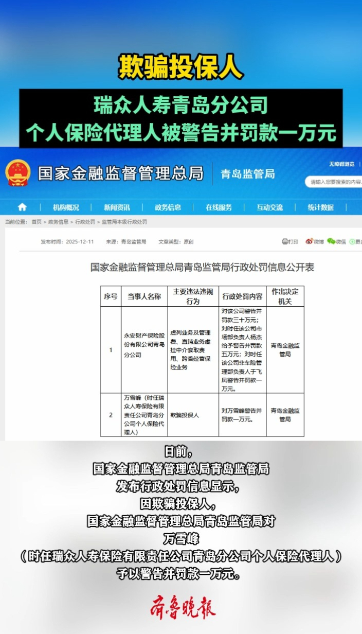 果然视频丨欺骗投保人!瑞众人寿青岛分公司这名员工被罚款1万元齐鲁晚报·齐鲁壹点客户端 14:10原创日前,国家金融监督管理总局青岛监管局发布行政处罚信息显示,因欺骗投保人,该局对万雪峰(时任瑞众人寿保险有限责任公司青岛分公司个人保险代理人)予以警告并罚款一万元。 (齐鲁晚报·齐鲁壹点记者 尚青龙)