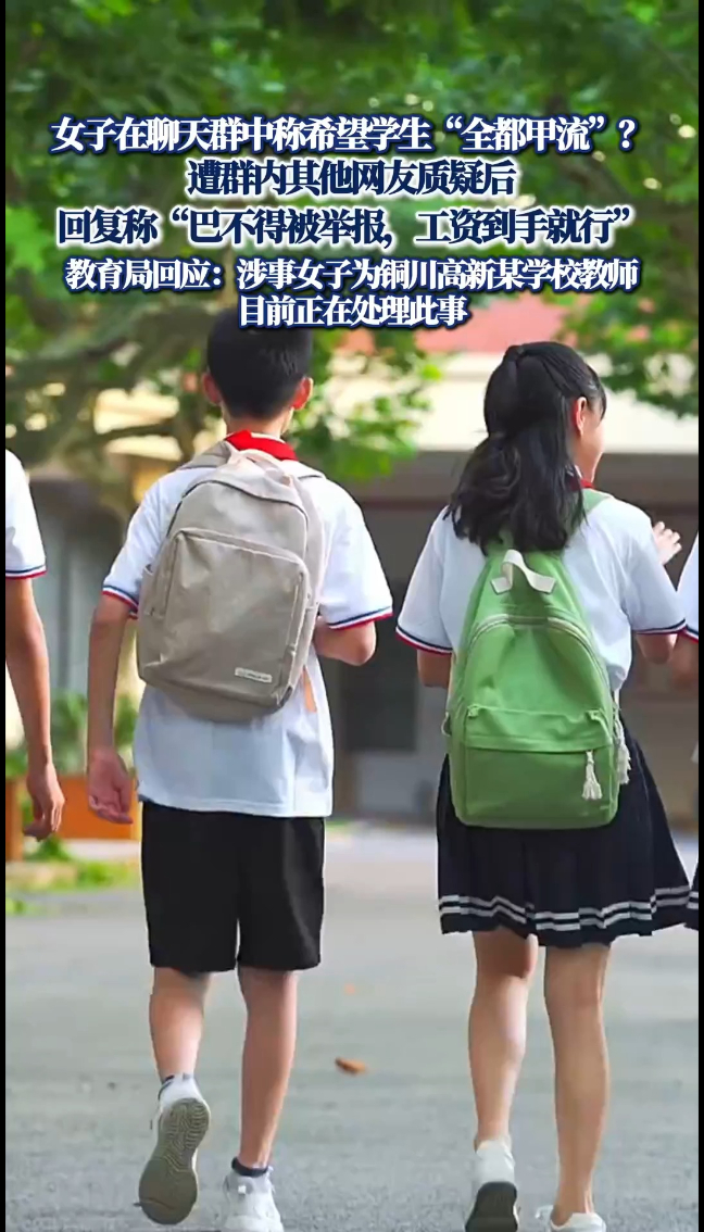 女子在聊天群中称希望学生“全都甲流”?教育局回应:涉事女子为铜川高新某学校教师,目前正在处理此事