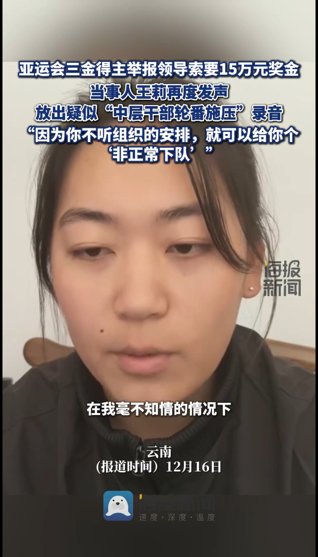 亚运会三金得主举报领导索要15万元奖金,当事人王莉再度发声,放出疑似“中层干部轮番施压”录音