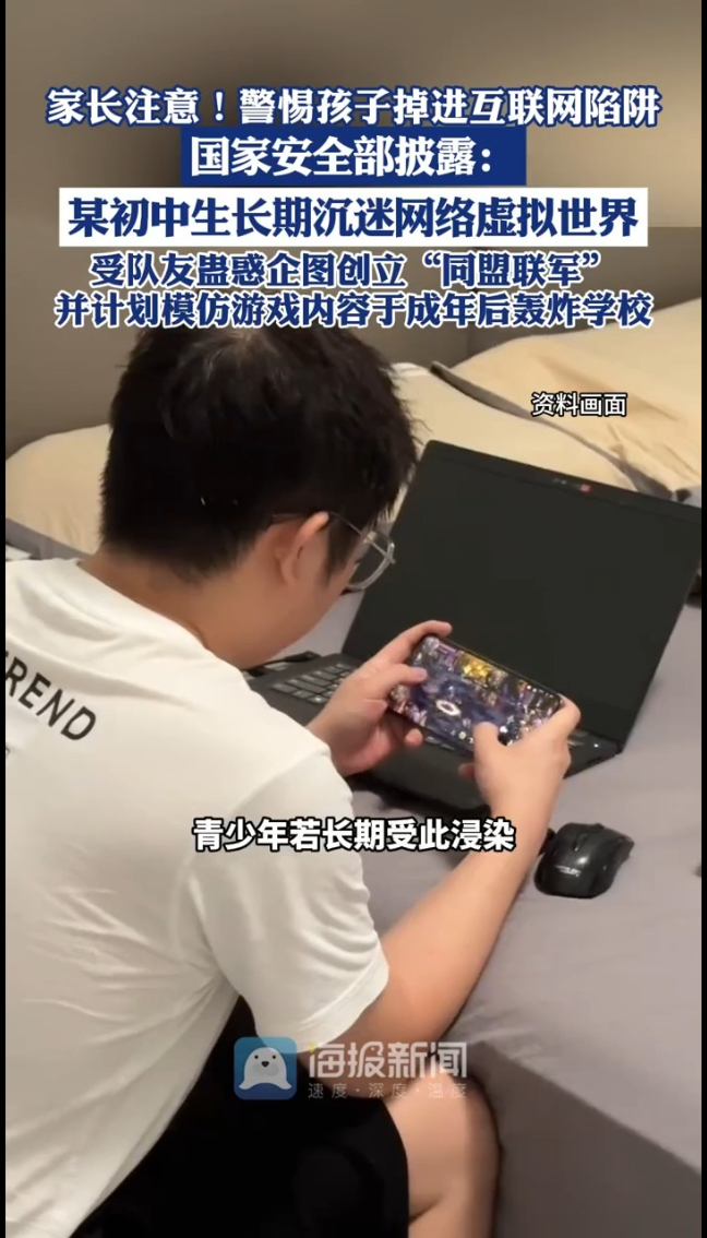 据国家安全部12月16日披露,某初中生长期沉迷于网络虚拟世界,认为“组队打怪”的队友游戏技术高超,常对其言听计从,受队友蛊惑企图创立“同盟联军”并计划亲身模仿游戏内容于成年后轰炸学校。