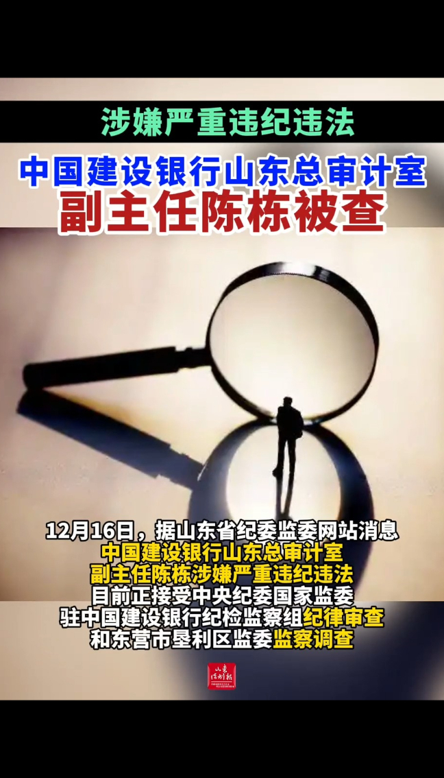 涉嫌严重违纪违法,中国建设银行山东总审计室副主任陈栋被查 昨天19:38 现场山东省纪委监委网站 微信扫码扫码下载客户端12月16日,据山东省纪委监委网站消息,中国建设银行山东总审计室副主任陈栋涉嫌严重违纪违法,目前正接受中央纪委国家监委驻中国建设银行纪检监察组纪律审查和东营市垦利区监委监察调查。
