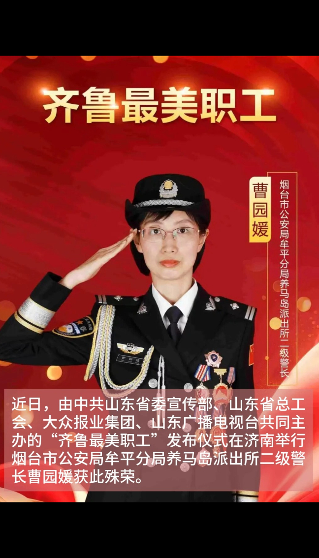 近日,由中共山东省委宣传部、山东省总工会、大众报业集团、山东广播电视台共同主办的“齐鲁最美职工”发布仪式在济南举行,烟台市公安局牟平分局养马岛派出所二级警长曹园媛获此殊荣。