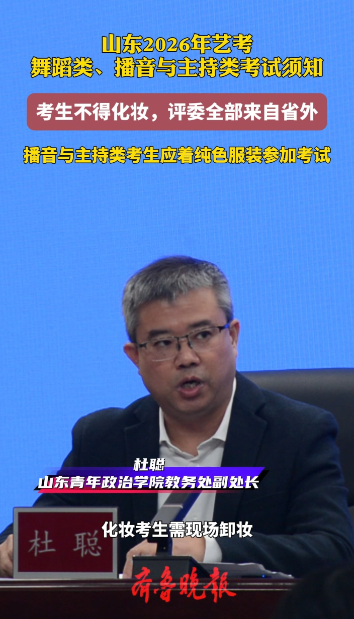 考生不得化妆!山东艺考统考舞蹈类、播音与主持类考试须知看这里大众报业·齐鲁壹点 昨天18:30山东2026年艺考统考舞蹈类播音与主持类现场考试将在山东青年政治学院双馨楼举行。今年舞蹈类、播音与主持类均要求考生“不得化妆”,化妆考生必须现场卸妆。舞蹈类现场测试对服装和鞋子均有规范要求,播音与主持类现场测试则明确要求“考生应着纯色服装”,请考生务必严格执行。此外,舞蹈类、播音与主持类现场测试考评专家全部从省外高校选聘。
