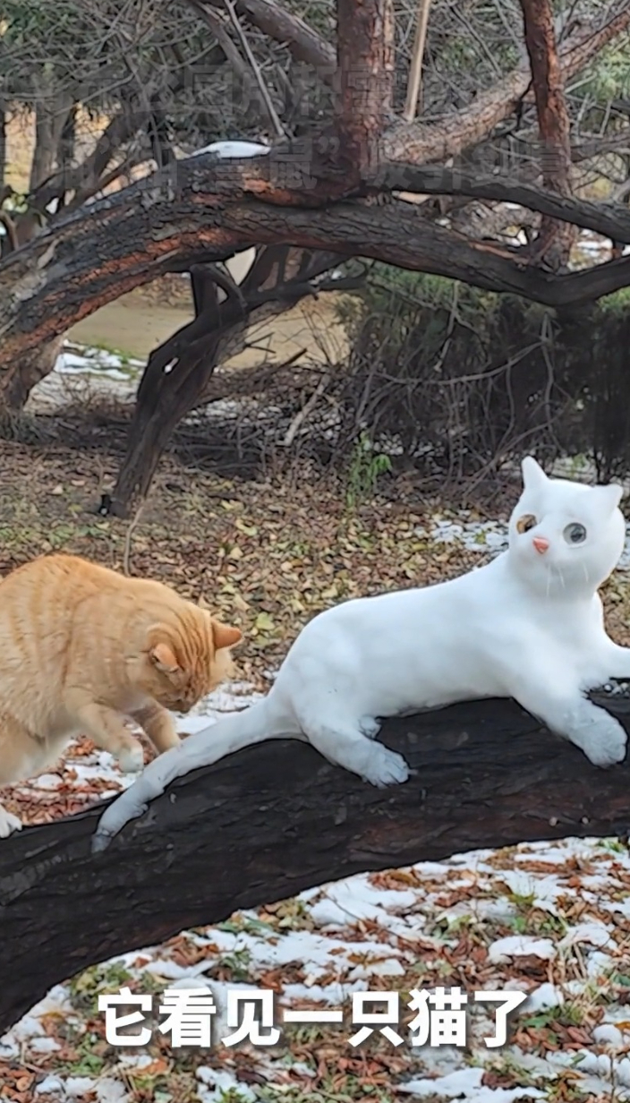 栩栩如生!大爷在公园用积雪堆出“雪猫”和“雪鼠”