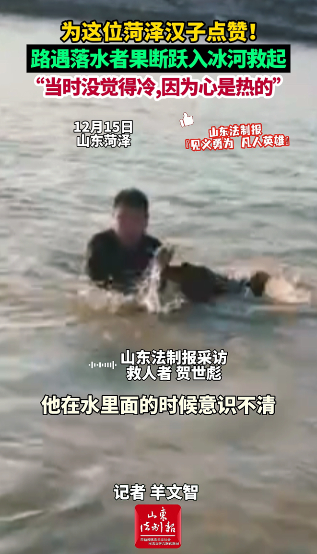 为这位菏泽汉子点赞!路遇落水者果断跃入冰河救起,“当时没觉得冷,因为心是热的” 昨天19:39 原创大众新闻·山东法制报 微信扫码扫码下载客户端12月15日下午,菏泽东明一名男子不慎落水,在水中挣扎。路过的贺世彪发现后,果断跃入冰冷河水,拼力将落水男子拽到岸上。事后,贺世彪在接受采访时表示:“当时下水救人没觉得冷,因为心是热的。”(大众新闻·山东法制报记者 羊文智)