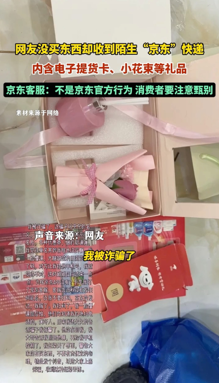 果然视频|网友没买东西却收到“京东”快递,京东:不是官方行为齐鲁晚报·齐鲁壹点客户端 昨天19:58原创近日,有网友发布视频称,自己在未购物的情况下收到了冒充京东发来的快递,评论区多名网友称也曾经收到过这种疑似诈骗的快递。12月16日,齐鲁晚报·齐鲁壹点记者针对此事联系京东客服了解情况。京东客服回应称,此类快递并非京东官方行为,同时提醒消费者提高甄别意识,注意防范相关风险。 (齐鲁晚报·齐鲁壹点记者 路董萌 实习生 高晓灿)