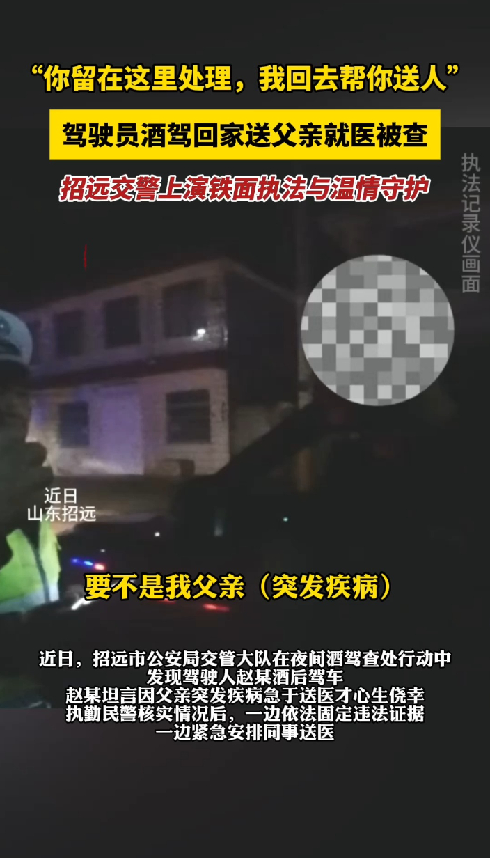 果然视频|司机酒驾回家送父就医被查,招远交警上演“铁面柔情”齐鲁晚报·齐鲁壹点客户端 09:33原创近期,招远市公安局交管大队在夜间酒驾查处行动中,上演了一场"法理兼顾情理"的暖心执法:驾驶人赵某酒后驾车被查,坦言因父亲突发疾病急于送医才心生侥幸,执勤民警核实情况后,一边依法固定违法证据,一边紧急安排同事送医,用"铁面"守规则,以"柔情"护民生。 (齐鲁晚报·齐鲁壹点 王琳 钟建军)