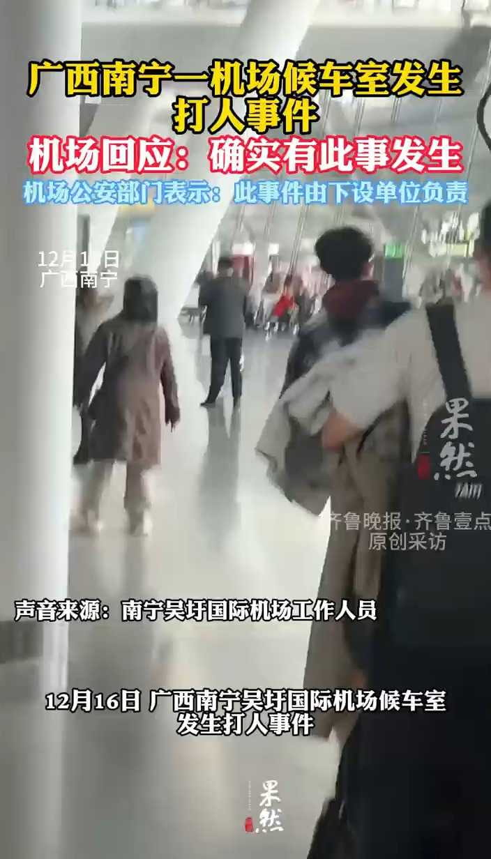 果然视频|南宁吴圩国际机场发生打人事件,机场回应:情况属实齐鲁晚报·齐鲁壹点客户端 12-17原创12月16日,广西南宁吴圩国际机场发生一起打人事件。17日,齐鲁晚报·齐鲁壹点记者从该机场工作人员处获悉,确有此事发生,具体情况需咨询南宁吴圩国际机场公安部门。随后,记者联系到该机场公安部门,其工作人员表示,该事件正由其下设单位负责处理。(齐鲁晚报·齐鲁壹点爆料电话:0531-85193656;邮箱:405617016@qq.com)(齐鲁晚报·齐鲁壹点 李苗 实习生 高文珊)