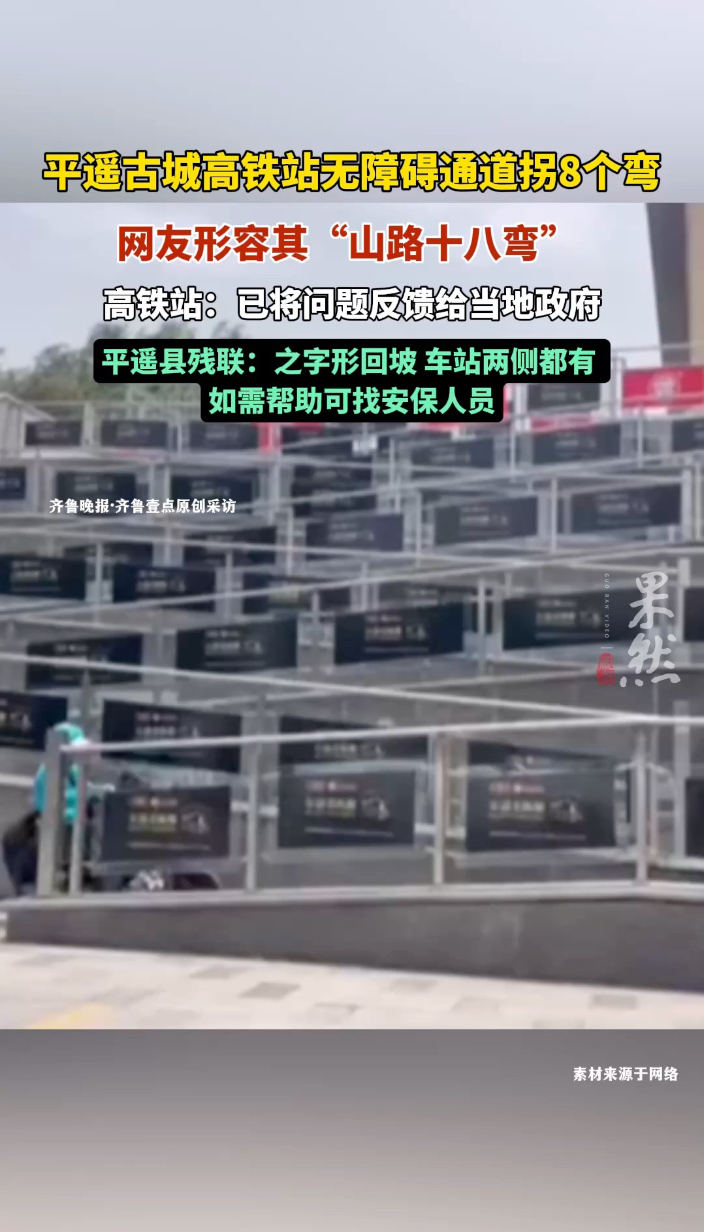 果然视频|无障碍通道被指要拐8个弯,平遥古城高铁站回应齐鲁晚报·齐鲁壹点客户端 12-17原创近日,山西平遥古城高铁站站前无障碍通道因设计成多段“之”字形转折引发关注,网友形容其为“山路十八弯”,并对其实际便利性提出质疑。12月17日,该高铁站工作人员告诉齐鲁晚报·齐鲁壹点记者,铁路只是使用单位,已将问题反馈给当地政府。平遥县残联工作人员表示,车站无障碍通道采用的是 “之” 字形回坡设计,通道两侧均有设置。 (齐鲁晚报·齐鲁壹点记者 胡玲玲 路董萌)
