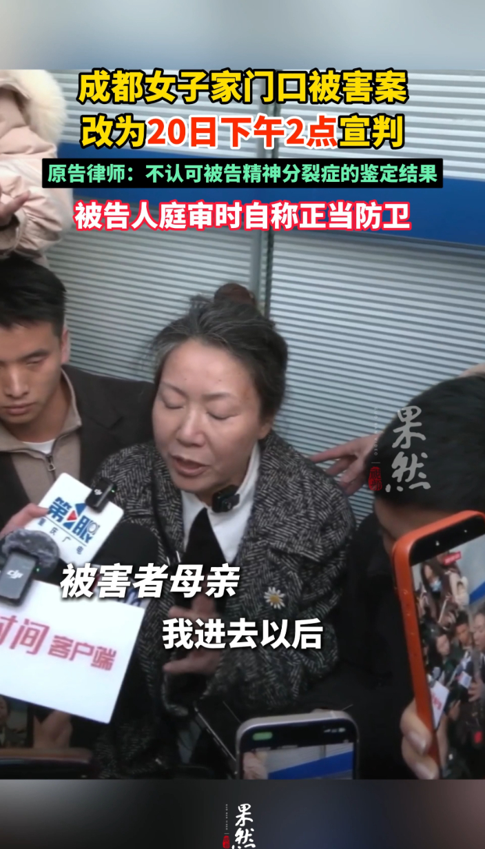 果然视频|“成都女子家门口被害案”一审将于20日宣判齐鲁晚报·齐鲁壹点客户端 12-17原创12月16日,成都女子家门口被害案第二次庭审结束。17日,被害者王某雅的母亲王女士对齐鲁晚报·齐鲁壹点表示,该案将于12月20日下午宣判。王女士的代理律师臧梵清告诉记者,被告人梁某滢辩称系正当防卫,他不认可梁某滢患精神分裂症的鉴定结果。(齐鲁晚报·齐鲁壹点 郭辰昊 胡玲玲)