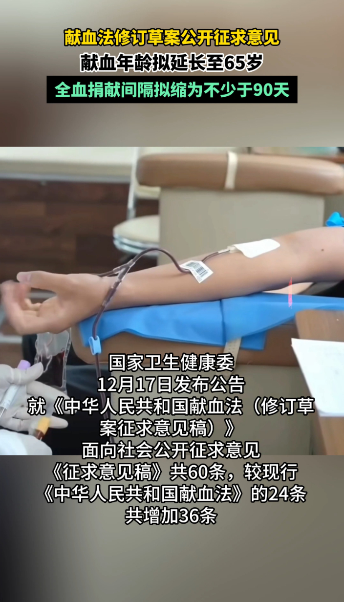 观政视频|献血法修订草案公开征求意见,献血年龄拟延长至65岁 12-17 原创齐鲁晚报·齐鲁壹点客户端 微信扫码扫码下载客户端国家卫生健康委12月17日发布公告,就《中华人民共和国献血法(修订草案征求意见稿)》面向社会公开征求意见。科学调整献血者年龄和间隔,献血者年龄从提倡十八周岁至五十五周岁修订为提倡十八周岁至六十五周岁的公民在符合健康要求的情况下自愿献血。血站对献血者每次采集全血不得超过四百毫升,两次采集全血间隔期不少于九十天。