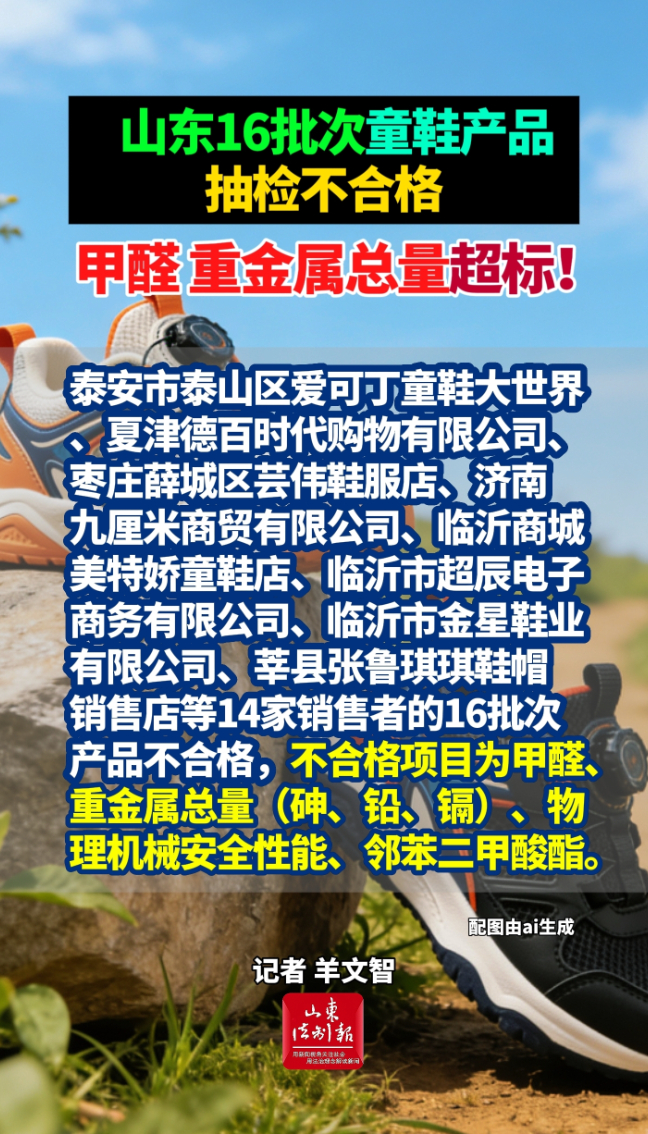 本次抽查发现滨州市滨城区梓柠服饰店、东营市垦利区全福元商业有限公司、高青县志威鞋店、青岛永旺东泰商业有限公司烟台购物中心、日照市东港区红贝儿童鞋店、日照市东港区婴易购孕婴店、泰安市泰山区爱可丁童鞋大世界、夏津德百时代购物有限公司、枣庄薛城区芸伟鞋服店、济南九厘米商贸有限公司、临沂商城美特娇童鞋店、临沂市超辰电子商务有限公司、临沂市金星鞋业有限公司、莘县张鲁琪琪鞋帽销售店等14家销售者的16批次产品不合格,不合格项目为甲醛、重金属总量(砷、铅、镉)、物理机械安全性能、邻苯二甲酸酯。