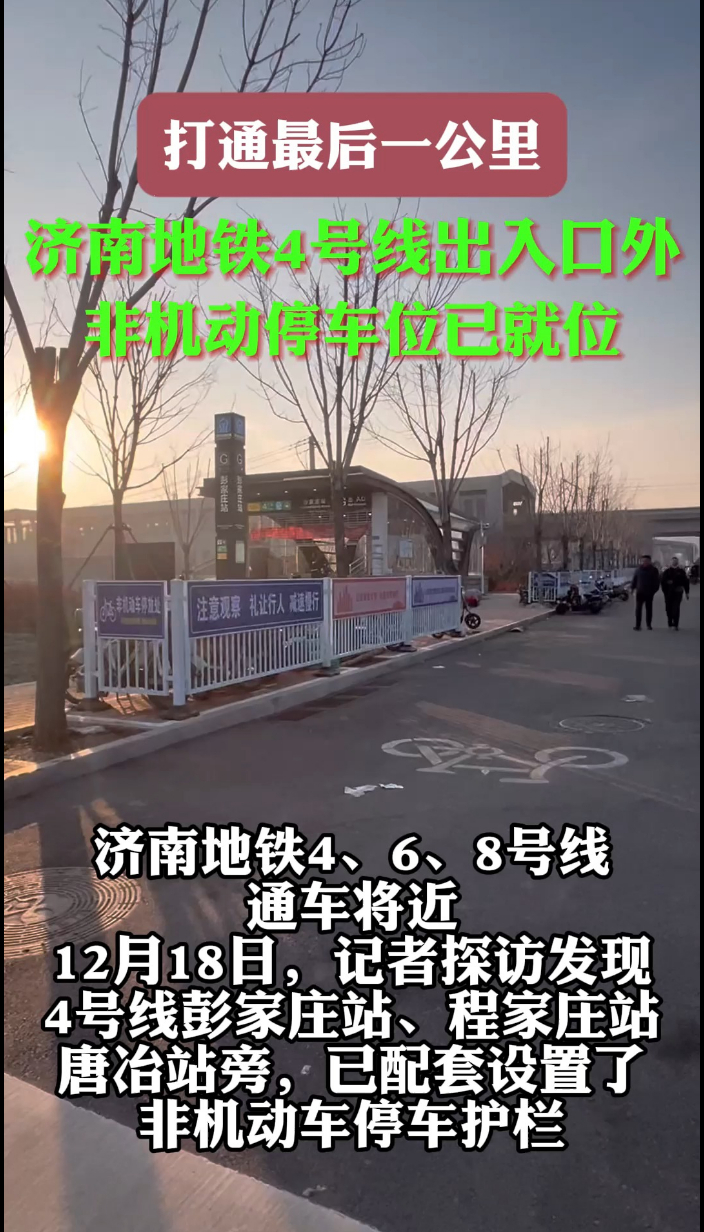 地铁通泉城|现场探访,4号线部分出入口外设起了非机动车停放位大众报业·齐鲁壹点 昨天12:18(齐鲁晚报·齐鲁壹点记者 王皇)济南地铁4、6、8号线通车将近,12月8日,记者探访部分4号线出入口发现,彭家庄站(工程名,下同)、程家庄站、唐冶站旁已配套设置了非机动车停车护栏,方便骑车市民换乘地铁,服务地铁出行最后一公里。
