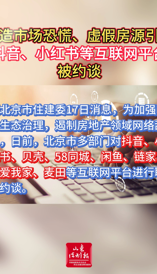 据北京市住建委17日消息,为加强网络生态治理,遏制房地产领域网络乱象,日前,北京市多部门对抖音、小红书、贝壳、58同城、闲鱼、链家、我爱我家、麦田等互联网平台进行联合约谈。