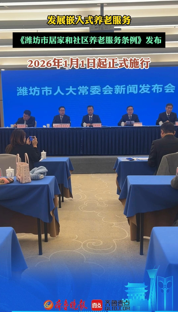 果然视频|《潍坊市居家和社区养老服务条例》明年1月1日实施齐鲁晚报·齐鲁壹点客户端 昨天17:22原创12月18日,潍坊市人大常委会在富华大酒店召开新闻发布会,介绍《潍坊市居家和社区养老服务条例》的起草、审查、审议修改情况、主要内容及贯彻实施意见。记者在会上获悉,《潍坊市居家和社区养老服务条例》的实施,是潍坊市积极应对人口老龄化、构建完善养老服务体系进程中的一件大事,标志着潍坊市养老服务工作进入了一个法治化、规范化发展的新阶段。 齐鲁晚报·齐鲁壹点 张晓慧
