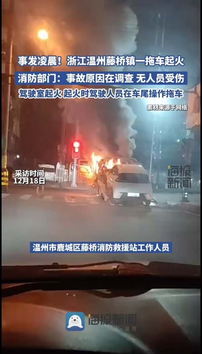 浙江温州藤桥镇一拖车凌晨起火 消防部门:在调查 起火时驾驶员在车后操作拖车