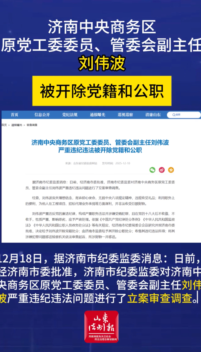 12月18日,据济南市纪委监委消息:日前,经济南市委批准,济南市纪委监委对济南中央商务区原党工委委员、管委会副主任刘伟波严重违纪违法问题进行了立案审查调查。