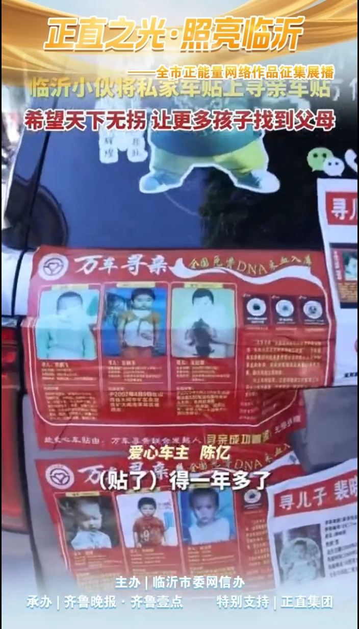 正直之光 照亮临沂|临沂小伙将私家车贴上寻亲车贴,愿天下无拐大众报业·齐鲁壹点 昨天18:21在临沂街头,一辆贴满寻亲启事的汽车在人流中格外醒目。车主表示,之前无意中接触到一个寻亲网站,被这份跨越山海的寻亲期盼深深触动,遂毅然决定将整车贴满寻亲信息。虽然爱车少了几分整洁精致,却以车身为媒、以善意为桥,为走失的孩子多铺了一条通往家的希望之路,让平凡的出行多了一份温暖的使命担当。