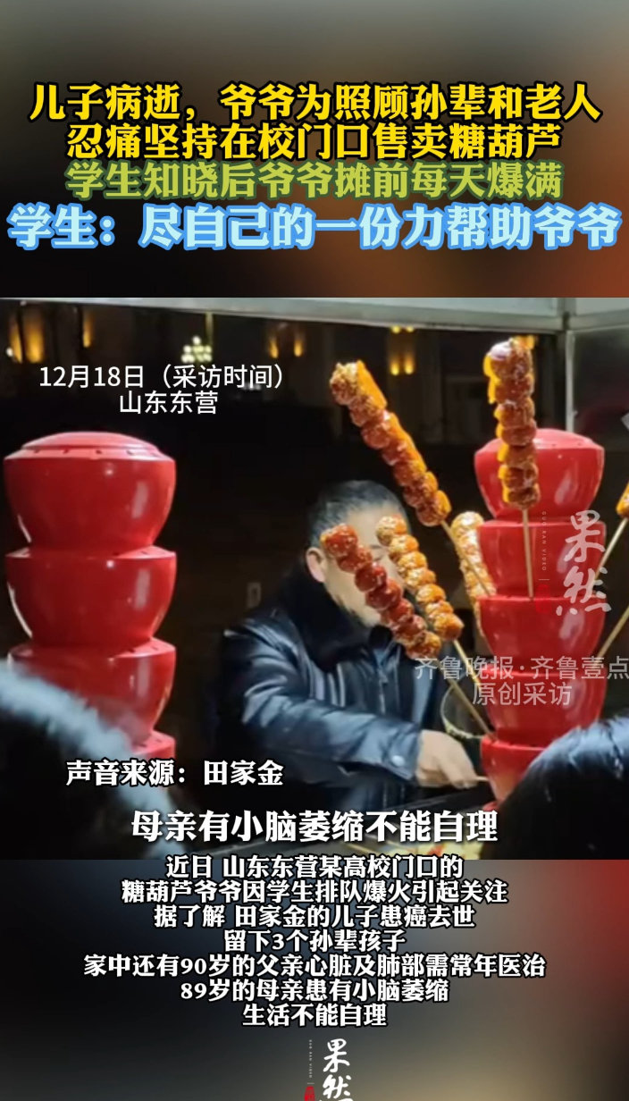 近日,东营某高校门口的糖葫芦爷爷田家金因学生排队火爆引起关注。他的儿子患癌去世,家中留下3个孙辈以及2位近百老人。田家金告诉记者,山东石油化工学院邀请他到学校食堂进行售卖。山东石油化工学院后勤管理中心工作人员表示,食堂已经设立了冰柜为大爷代售糖葫芦。(齐鲁晚报·齐鲁壹点爆料电话:0531-85193656;邮箱:405617016@qq.com)(齐鲁晚报·齐鲁壹点 刘志坤 实习生 高文珊)