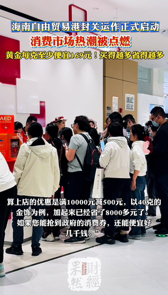 海南探封关|消费者免税店排长队抢购商品,黄金每克便宜近两百齐鲁晚报·齐鲁壹点客户端 昨天21:29原创12 月 18 日,海南自由贸易港封关运作正式启动,自贸港政策红利加速释放。记者实地探访海口骑楼老街、cdf 海口日月广场免税店及海控全球精品免税城发现,全岛封关的政策东风正点燃消费市场热潮。