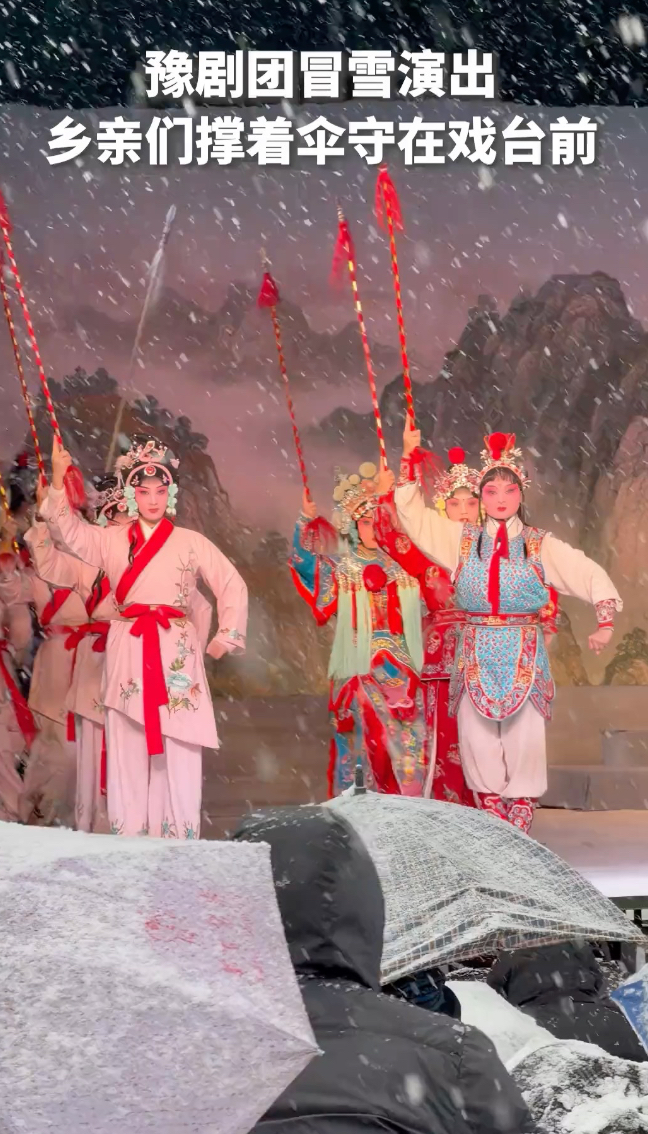 大雪纷飞,戏未停歇。台上,河南豫剧院青年团演员倾情献唱;台下,观众撑伞静立、认真聆听