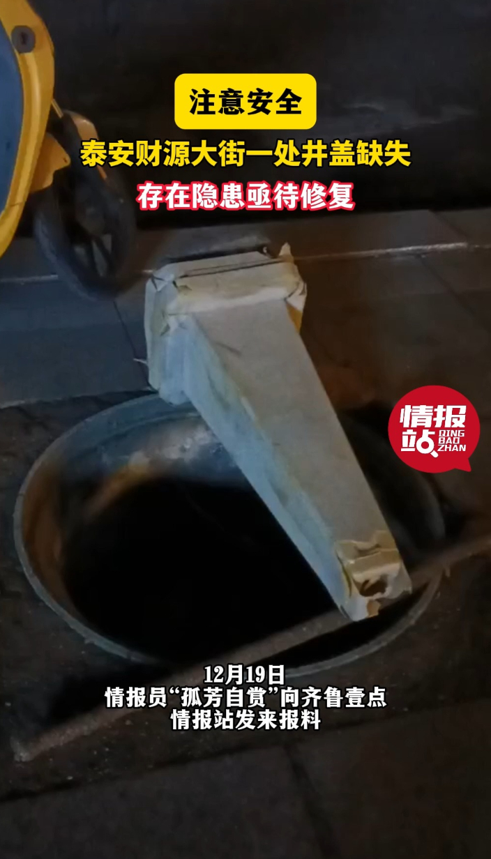 情报站|注意安全!泰安财源大街一处井盖缺失,存在隐患亟待修复 昨天08:31 大众报业·齐鲁壹点 微信扫码扫码下载客户端12月19日,情报员“孤芳自赏”向齐鲁晚报官方客户端齐鲁壹点情报站报料,19日早上6点30分,在泰安市泰山区财源大街,老百货大楼北侧公交站牌旁,情报员看到这里有一处井盖缺失。“由于路灯故障,路边漆黑一片,存在一定的安全隐患,希望能引起相关部门重视,及时核实处理修复”情报员说。