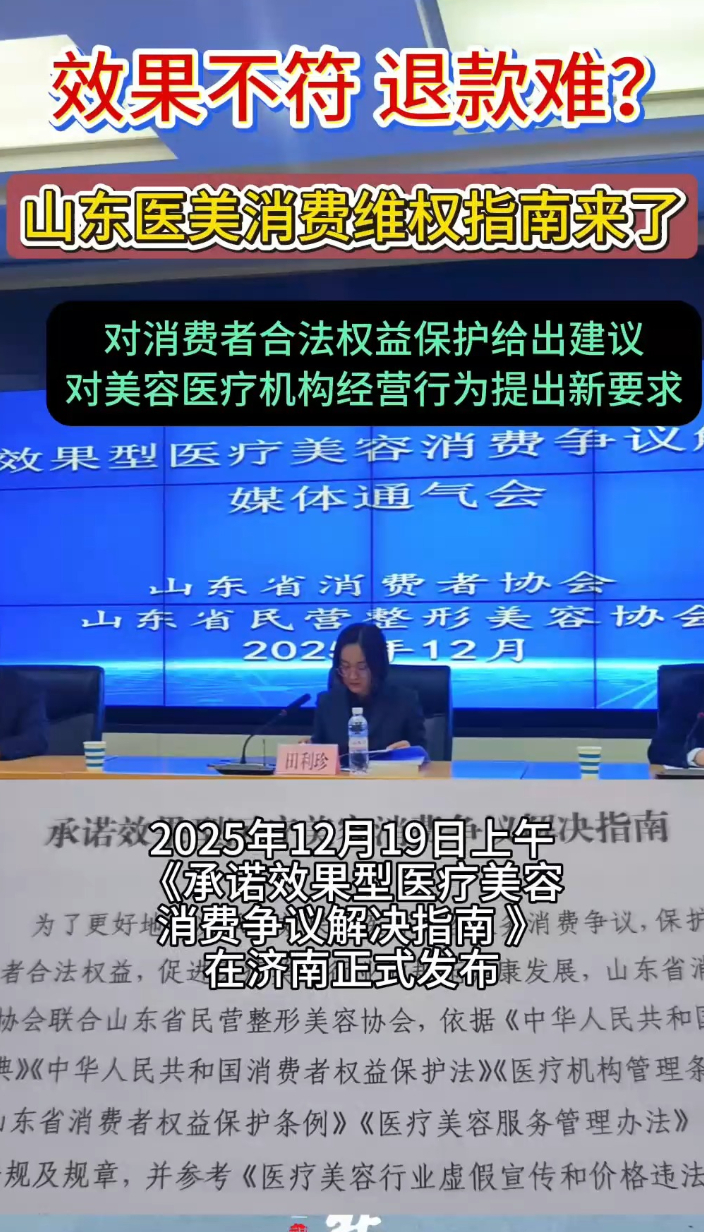 12月19日上午,《承诺效果型医疗美容消费争议解决指南》(简称《指南》)在济南正式发布。该《指南》由山东省消费者协会联合山东省民营整形美容协会依据《中华人民共和国民法典》《山东省消费者权益保护条例》《山东省医疗美容项目分级管理目录》等多个规范性文件,结合山东省医疗美容行业发展实际制定。《指南》 对消费者合法权益保护给出更全面建议,对美容医疗机构经营者经营行为提出新要求。(齐鲁晚报·齐鲁壹点徐田田)
