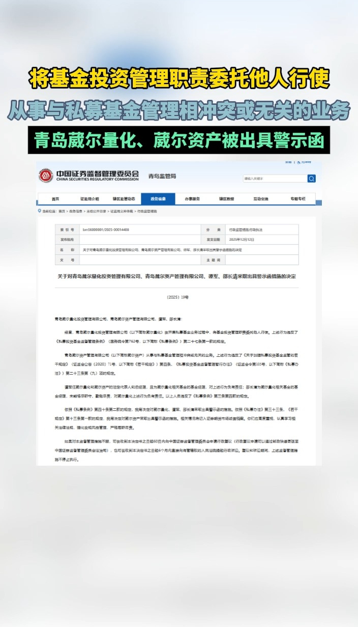 果然视频丨涉两项违规行为,青岛葳尔量化、葳尔资产被出具警示函齐鲁晚报·齐鲁壹点客户端 昨天15:02原创日前,青岛证监局发布关于对青岛葳尔量化投资管理有限公司、青岛葳尔资产管理有限公司、谭军、邵长清采取出具警示函措施的决定。经查,青岛葳尔量化投资管理有限公司在开展私募基金业务过程中,将基金投资管理职责委托他人行使。青岛葳尔资产管理有限公司从事与私募基金管理相冲突或无关的业务。(齐鲁晚报·齐鲁壹点记者 尚青龙)