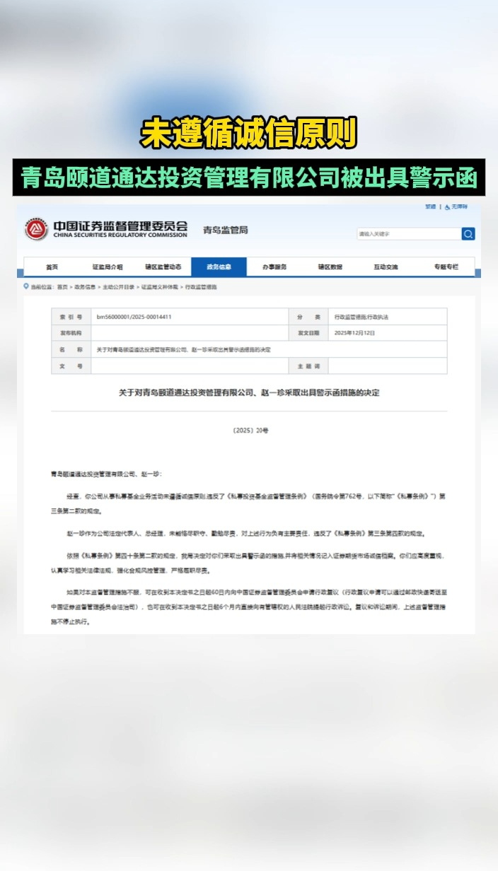果然视频丨未遵循诚信原则!青岛颐道通达被出具警示函齐鲁晚报·齐鲁壹点客户端 昨天15:02原创日前,青岛证监局发布关于对青岛颐道通达投资管理有限公司、赵一珍采取出具警示函措施的决定。经查,青岛颐道通达投资管理有限公司从事私募基金业务活动未遵循诚信原则。赵一珍作为公司法定代表人、总经理,对上述行为负有主要责任。(齐鲁晚报·齐鲁壹点记者 尚青龙)
