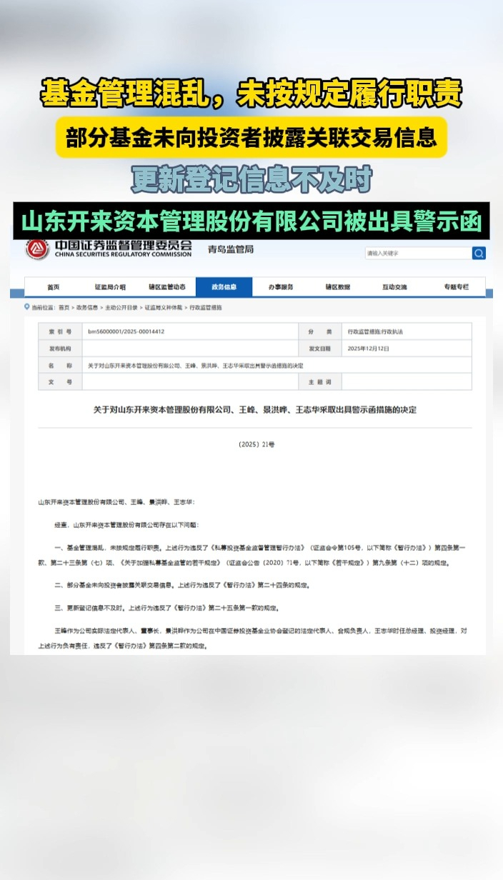 果然视频丨山东开来资本管理股份有限公司被出具警示函齐鲁晚报·齐鲁壹点客户端 昨天15:02原创日前,青岛证监局发布关于对山东开来资本管理股份有限公司及主要相关负责人王峰、景洪晔、王志华采取出具警示函措施的决定。经查,山东开来资本管理股份有限公司存在基金管理混乱,未按规定履行职责,分基金未向投资者披露关联交易信息,更新登记信息不及时等问题。(齐鲁晚报·齐鲁壹点记者 尚青龙)