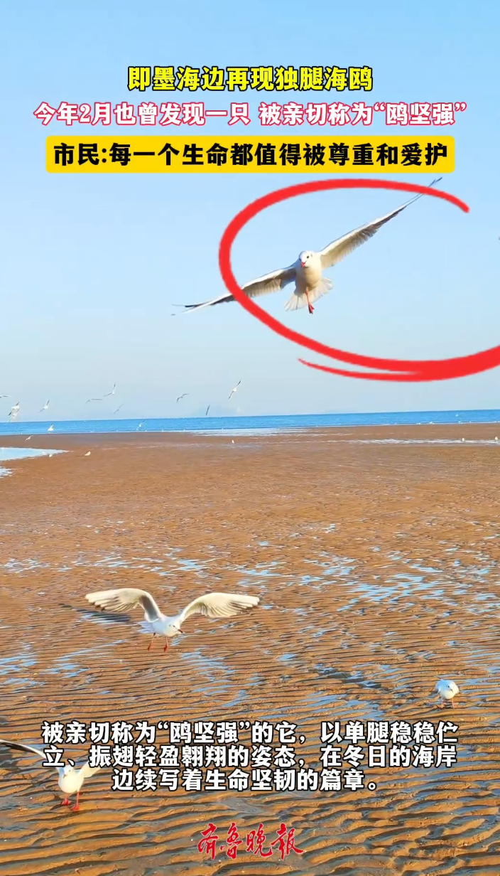 果然视频丨即墨海边,又见“鸥坚强”齐鲁晚报·齐鲁壹点客户端 昨天15:02原创日前,青岛蓝谷人才公园的海边,一只独腿海鸥的身影再次成为市民与游客关注的焦点。被亲切称为“鸥坚强”的它,以单腿稳稳伫立、振翅轻盈翱翔的姿态,在冬日的海岸边续写着生命坚韧的篇章。这是该海域今年内第二次观察到此类独腿海鸥。(齐鲁晚报·齐鲁壹点 宋祖锋)