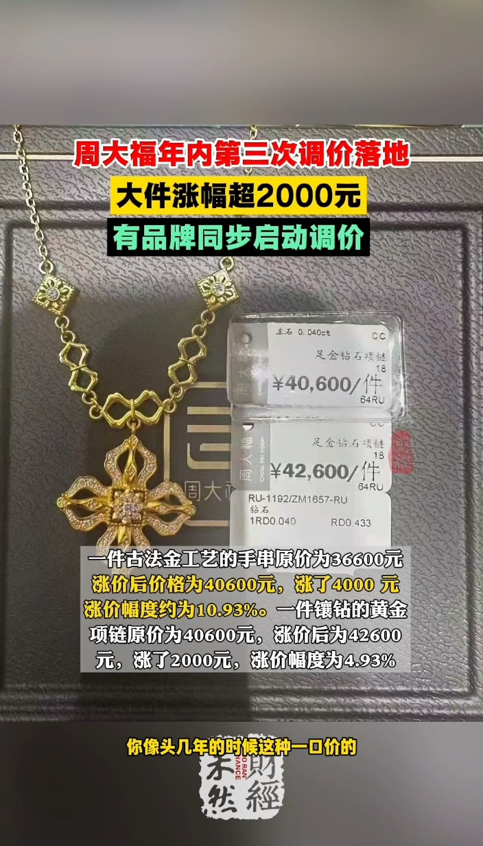 果然财经|周大福大件涨幅超2000元,有品牌已跟进涨价齐鲁晚报·齐鲁壹点客户端 昨天15:51原创“一口价黄金确实都涨了,串珠类涨得少点,200到300元不等,项链和手镯这类大件,涨幅基本都过两千了。”周大福的一名店员一边整理柜台里的黄金手镯,一边向记者介绍,早上刚完成最后一批价签更换,具体哪些产品调价,最终得以电脑系统显示为准。