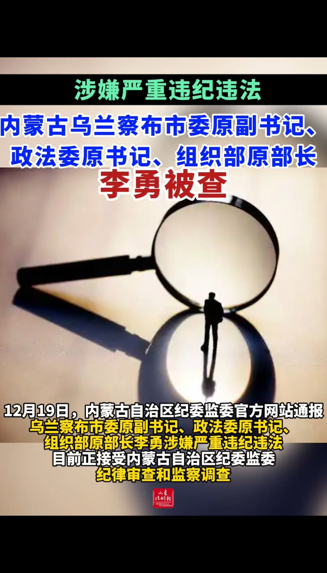 内蒙古乌兰察布市委原副书记、政法委原书记、组织部原部长李勇被查 昨天21:08 现场法治日报 微信扫码扫码下载客户端12月19日,内蒙古自治区纪委监委官方网站通报,乌兰察布市委原副书记、政法委原书记、组织部原部长李勇涉嫌严重违纪违法,目前正接受内蒙古自治区纪委监委纪律审查和监察调查。