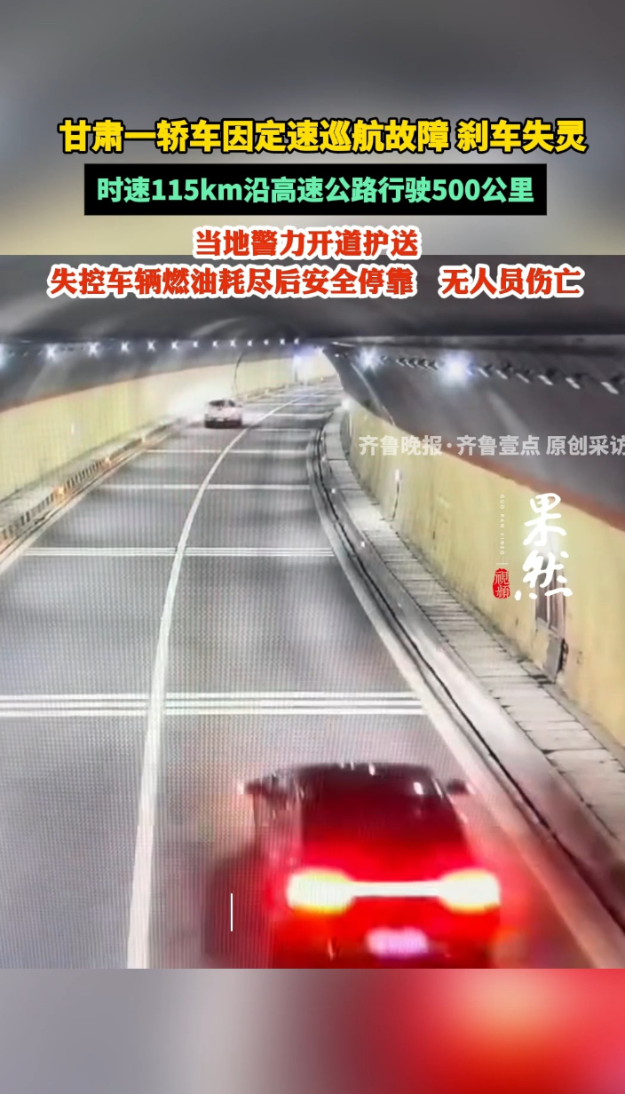 果然视频丨巡航锁死!时速115狂奔490公里高速上演生死时速齐鲁晚报·齐鲁壹点客户端 昨天19:00原创12月17日晚 ,一辆甘肃牌照轿车在G75兰海高速上开启115km/h定速巡航后突发故障,刹车踏板失效且无法退出巡航。甘肃定西、陇南两地交警启动应急预案,封闭沿途11个收费站入口,清空车道。一路上,交警前面开道,路政后面压阵,组成“护航编队”。失控车辆最终在G75兰海高速 (四川方向)强家湾隧道因燃油耗尽安全停靠,未发生碰撞或人员伤亡。