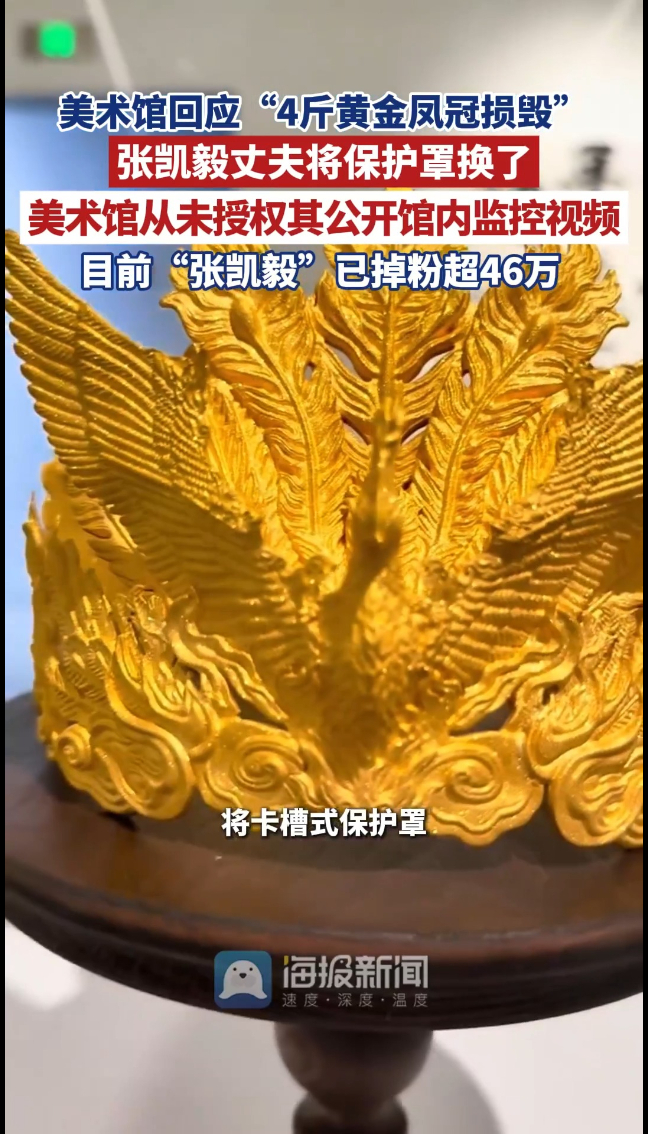 美术馆回应“4斤黄金凤冠损毁”:张先生本人(张凯毅丈夫)将卡槽式保护罩换成亚克力防尘罩, 美术馆事先不知晓参展艺术家家属在网络上发布相关内容。也从未授权其公开使用馆内监控视频信息,并保留追诉的权利。目前作品正走保险理赔和维修流程。此外,美术馆向所有被本次事件影响的人致歉,抱歉占用了公共资源。
