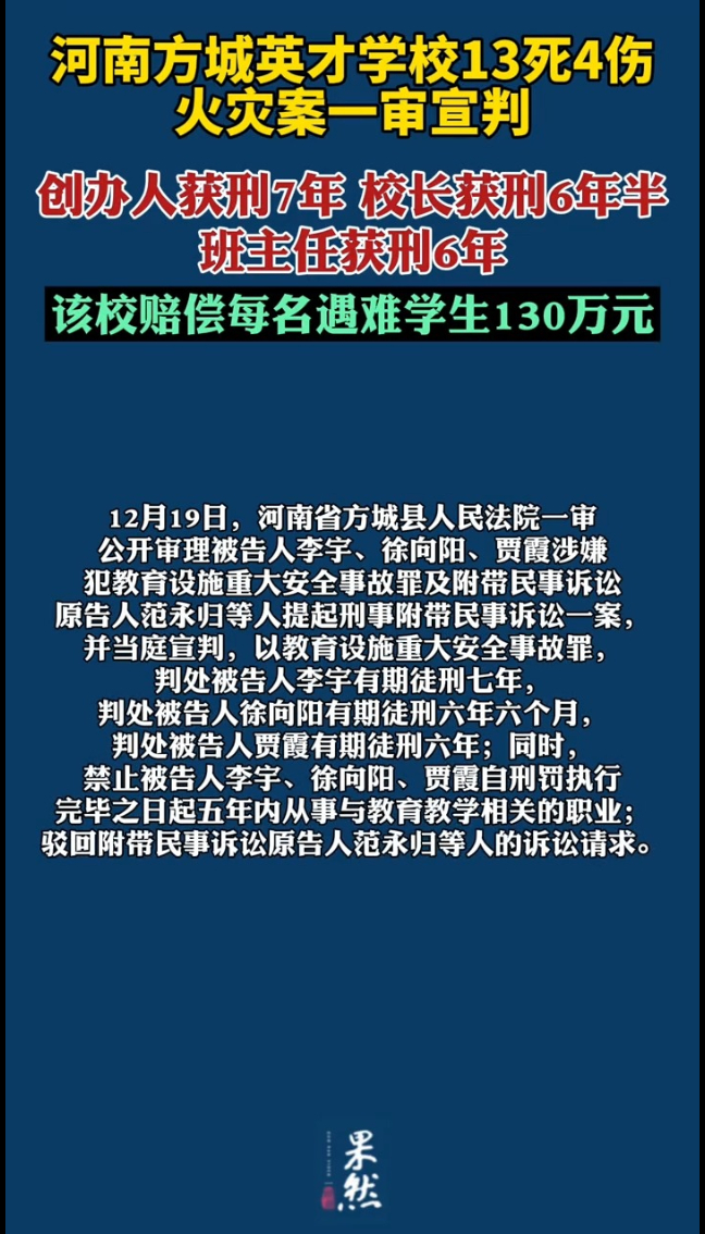 方城县校园大火案一审宣判:学校创办人等3人获刑