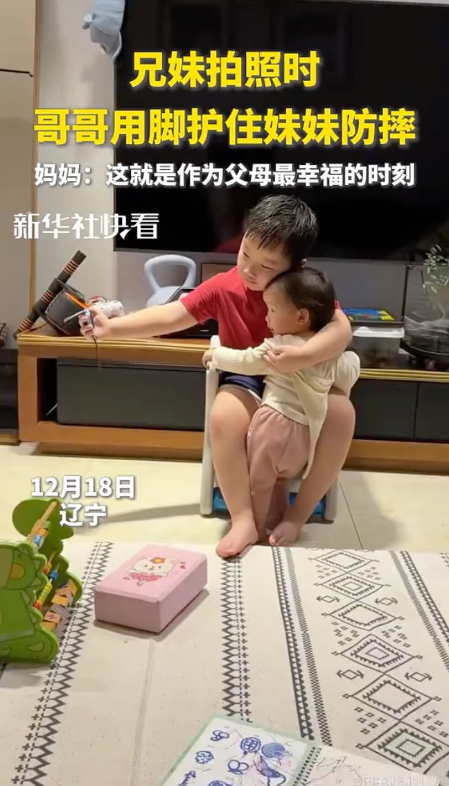 兄妹拍照时,哥哥用脚护住妹妹防摔,妈妈:这就是作为父母最幸福的时刻
